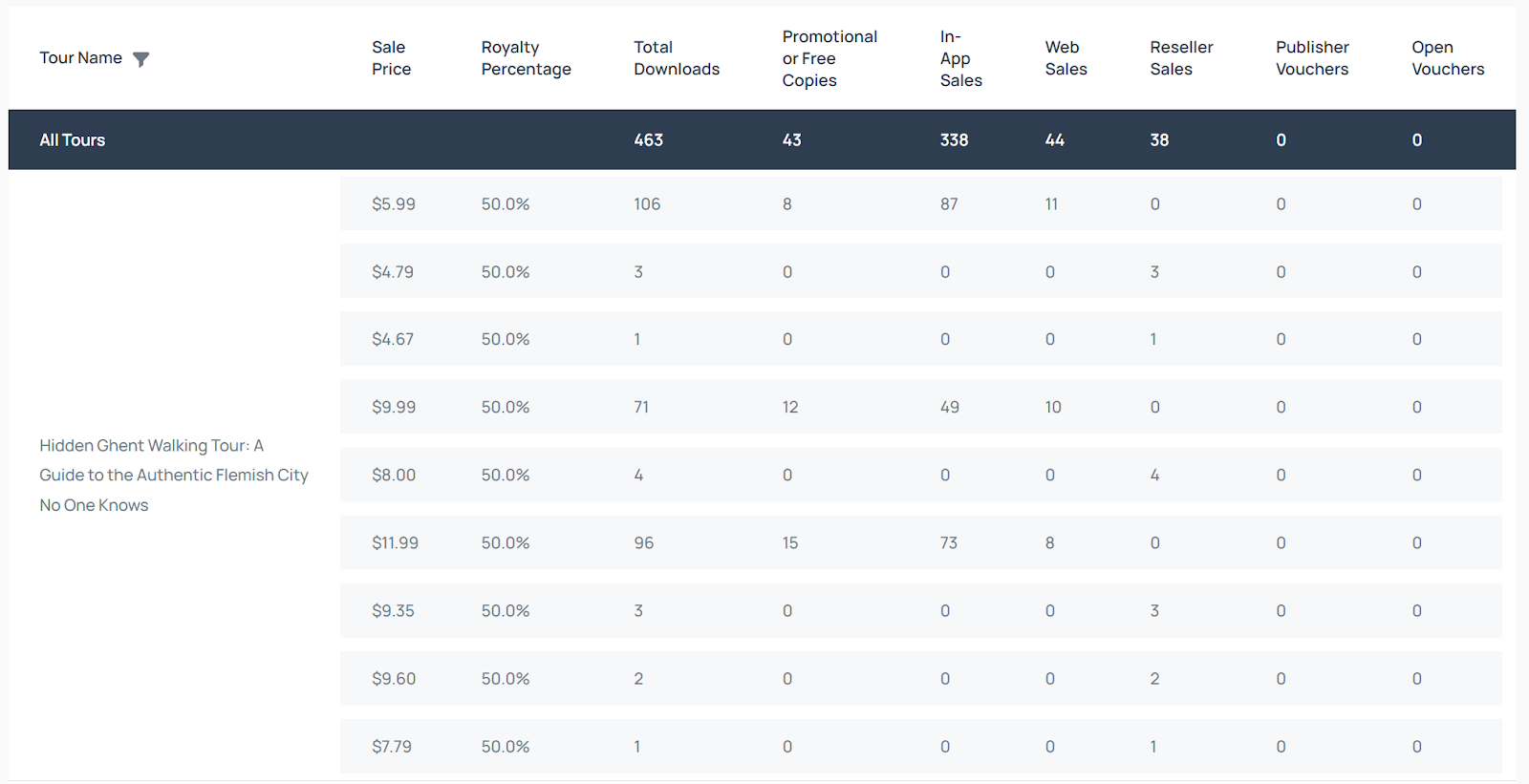- Sales Price: The price paid for the sales in that row. If you have changed the price of your tour over time, the different prices will appear as different rows. You'll also see different prices for downloads through different channels (the apps, resellers, etc.), due to the different transaction charges the channels apply.