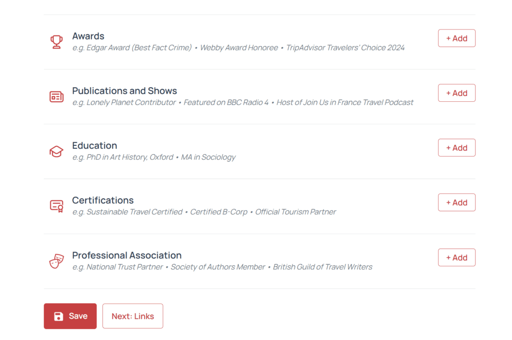 Add all relevant credentials that support your authority in your tour topics. Quality matters more than quantity – focus on credentials that genuinely enhance your credibility.
