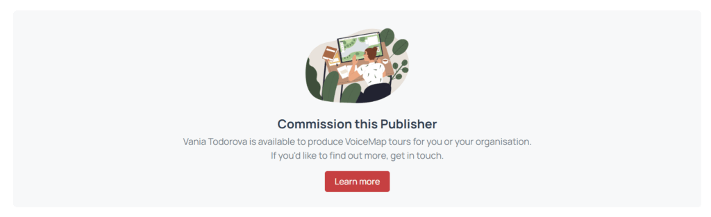 When you enable this feature, a “Commission this Publisher” option appears on your profile, opening up additional revenue opportunities. Organisations can use it to request more information about working with you on custom tour projects, and the VoiceMap team will help you deliver a proposal.